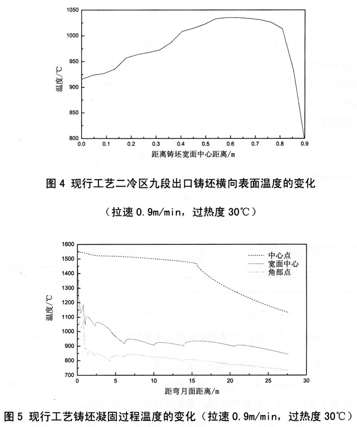 图4中的温度曲线显示,铸坯宽面中心处的温度仅为921℃,远低于同一断面上的最高温度1028℃,也低于铸坯宽面1/4处的温度,温度分布极不均匀,说明了图3中的水流密度分布的不均匀对温度分布产生的影响。