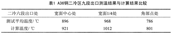 在现行工艺下,连铸机生产含铌船板钢A36的过程中,采用智能红外测温仪检测铸坯凝固过程中二冷区九段出口板坯表面不同三点的温度,测温结果见表1。将实验测得数据与图5的仿真结果进行对比。计算结果普遍比实测温度偏高,主要原因是铸坯表面凸凹不平,使铸坯的黑度系数变大、检测温度偏低。而在计算中认为铸坯表面是光滑平整的,另外,考虑到水流密度大的地方测温时受水雾影响也较大,如宽面四分之一处实测与计算的偏差值就比角部处的大。所以,计算的温度较实测值普遍偏高,最大相对误差4.34%,由此认为计算的温度值较准确,所建立的模犁是合理、准确的。