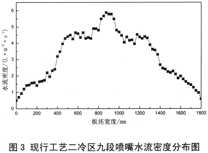 从图3可以看出,由于板坯宽面中心部位受三个喷嘴水量的冲击叠加,水流密度在整个铸坯宽度方向上分布很不均匀,中心部位的水流密度明显高于两侧,呈现山峰状。导致冷却不均匀,易引起铸坯缺陷。