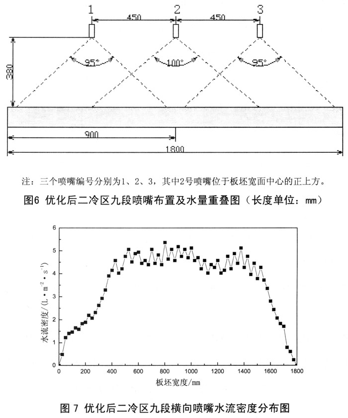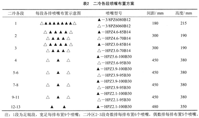 在充分考虑最小技术改造投入的目标下,保持二冷系统喷淋架不变,在上述研究的基础上,主要从喷嘴的选型与布置及配水参数优化的角度对二次冷却系统进行优化。