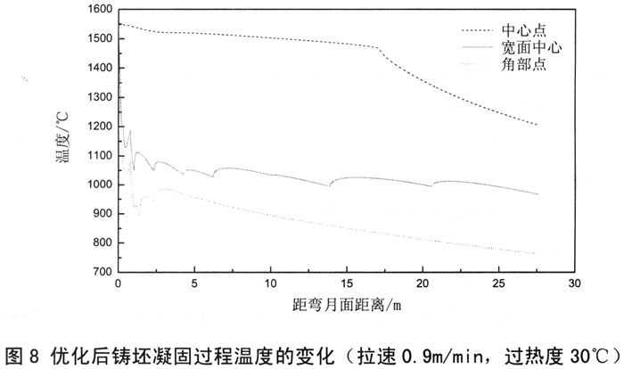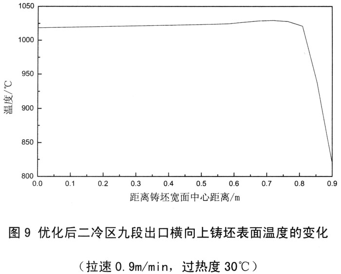 由于优化喷嘴的选型和布置后水流密度分布比较均匀,相应铸坯横断面上温度分布也随之均匀,如图9所显示二冷九段末铸坯表面横向上的温度变化,宽面中心部分和1/4处的温度基本上保持一致,在接近边角部时,温度逐渐下降,达到角部最低温度800~C。温度分布的均匀性降低了热应力,对于减小铸坯发生内裂纹,起到了良好的促进作用。但实际效果还有待于进一步的验证。