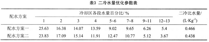 确定工艺优化方案时,应控制表面降温速率不超过为200"C/m,回温速率不超过为100℃/m,且保证温度不掉入矫直脆性“口袋区”。针对配水方案一的情况,应适量减小比水量,同时,减弱4段以及矫直区的冷却强度,综合考虑上述因素,最终确定的优化冷却强度参数(配水方案二)如表3所示。