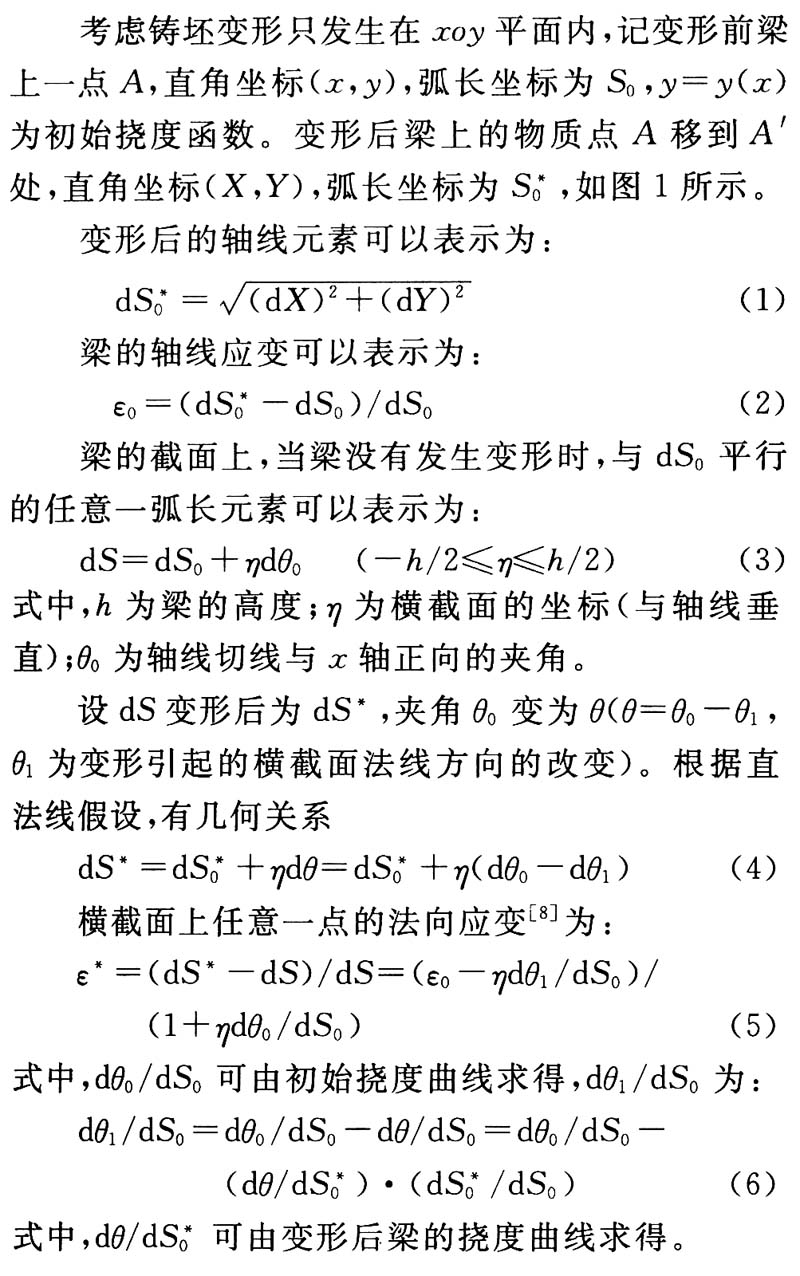 在多点矫直铸坯变形的研究中,常将两个矫直辊之间的一段铸坯按直梁处理。由于多点矫直时铸坯在两个矫直辊之间的曲率是不变的,并且铸坯的曲率很小,将坯壳简化为直梁进行计算带来的误差在工程上是可以忽略的。但是在连续矫直铸坯变形的研究中不能这样简化,对此这里应用曲线梁理论对坯壳的应变进行计算,这里的曲线梁不同于一般定义中曲率恒定的圆弧形曲梁,连续矫直过程中坯壳的曲率是变化的。