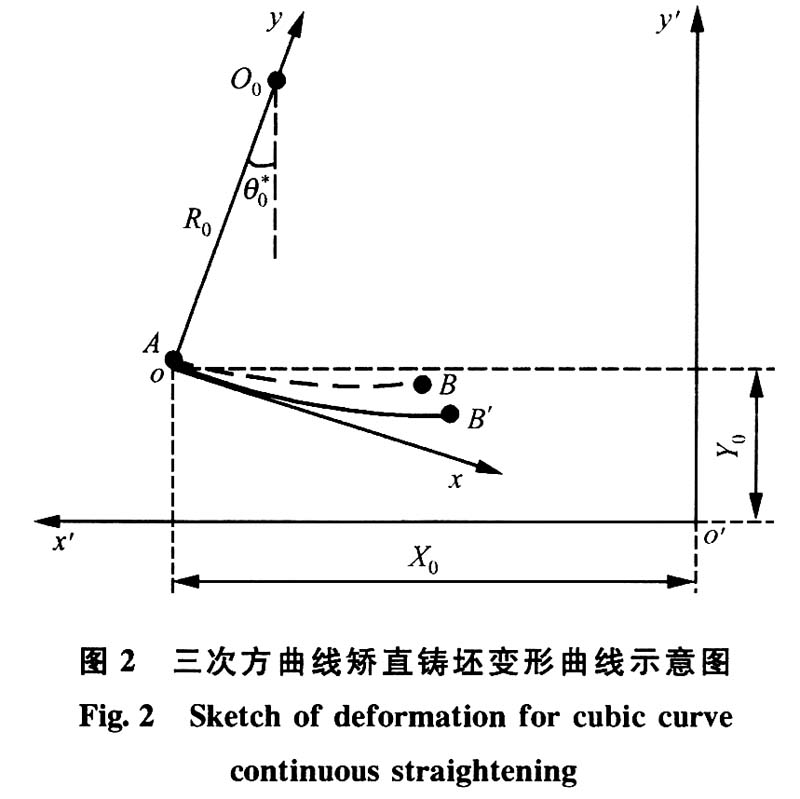 三次方曲线连续矫直与多点矫直情况下铸坯的曲线如图2所示。变形前铸坯为以O0为圆心R0为半径的圆弧,变形后为三次方曲线。以A为原点,该点法线方向为y向,切线方向为x向,建立局部坐标系xoy。