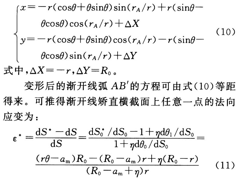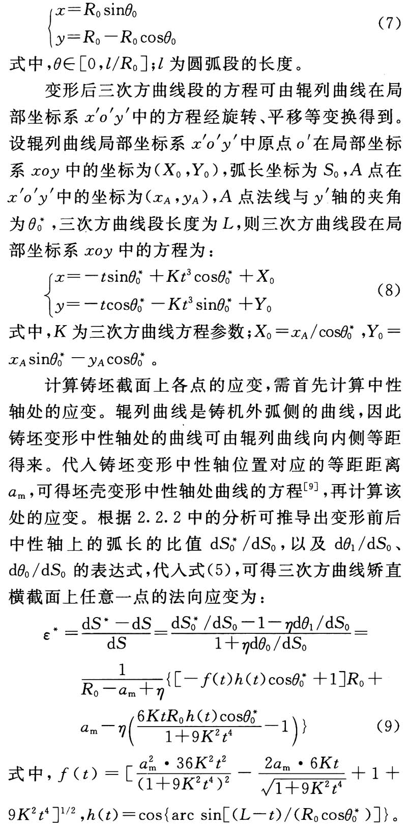 (2)针对连续矫直曲线由两段曲线光滑连接组成的连续矫直技术中常用的三次方曲线以及渐开线两种曲线,采用曲梁理论分别推导了这两种矫直曲线坯壳断面应变的计算公式。