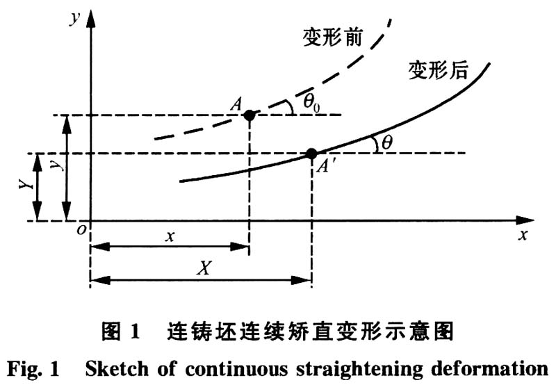 (2)铸坯连续矫直过程中的变形属于小变形,满足直法线假设[7],变形前垂直于轴线的横截面,变形后仍为平面,且仍然垂直于变形后的轴线。