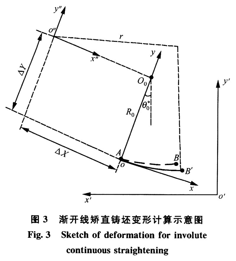 渐开线连续矫直与多点矫直情况下铸坯的曲线如图3所示。在以A为原点的局部坐标系xoy中,记渐开线基圆圆心在局部坐标系中的坐标为(ΔX,ΔY),A点的半径rA,r为基圆半径,则渐开线方程为: