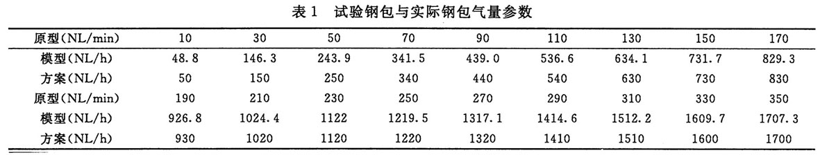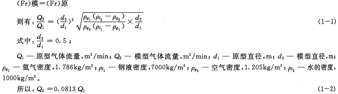 根据全浮力模型理论,气泡浮力是驱动钢水循环流动的源动力,所以需要保证原型与实物的Fr准数的相等,就能保证动力学相似。
