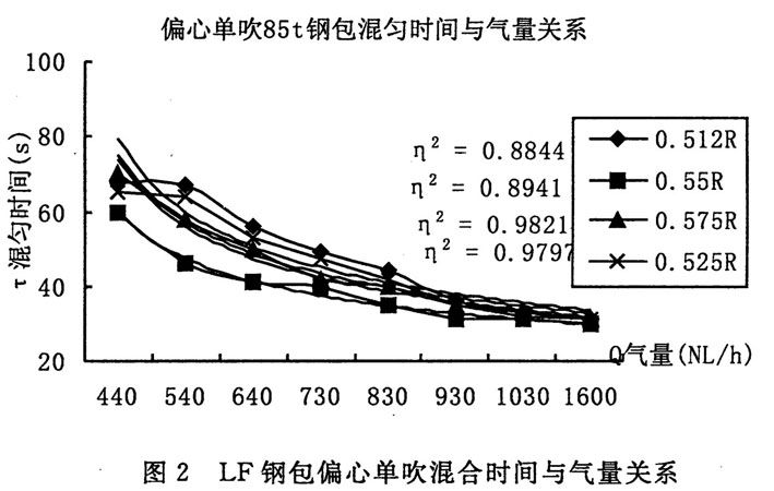 根据国内外学者的研究结论,钢包的混匀时间除与吹氩气量有关外,还与钢包的内型参数H、D,吹气口的形状和大小等因素有关。