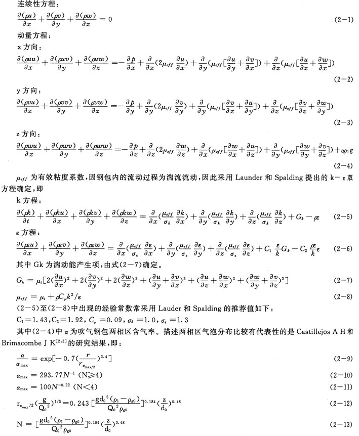 钢包内钢水流动可视为不可压缩流,因此,描述圆筒反应器内三维流动可用连续性方程、Navier Stokes方程及湍流模型来描述。