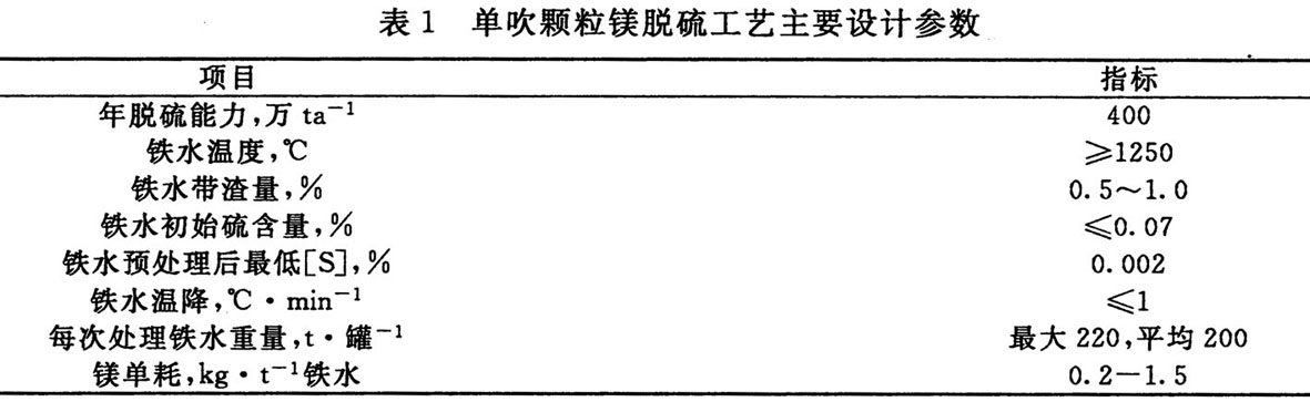 迁钢3座铁水预处理装置均采用单吹颗粒镁脱硫技术,自主研究开发了铁水脱硫专家系统,完善工艺操作,优化技术工艺参数。迁钢公司铁水脱硫扒渣投产后,最低脱硫后铁水中S达到0.002%。颗粒镁单耗0.40 kg/t。主要工艺设计参数见表1。