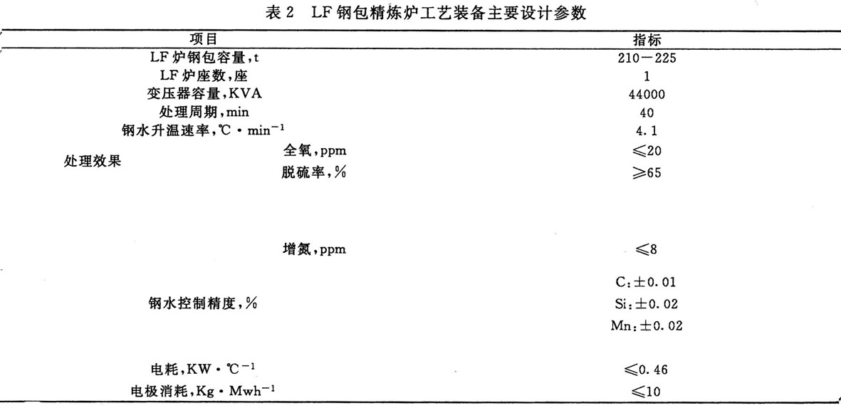 LF钢包炉精炼炉由首钢与意大利达涅利公司联合设计,外方技术总承包,采用双工位电极旋转式布置,每个工位都配有包盖、底吹系统、合金加料系统、喂丝系统、渣厚测量装置以及可保证不间断加热的超大功率的变压器。LF炉具有搅拌、加热、渣洗、喷粉、喂线、合金化等功能,可实现脱氧、深脱硫、去除夹杂、精确控制钢水成分和均匀温度、夹杂物变性处理等冶金目的。通过LF炉精炼工艺可以顺利的生产高纯净度的优质钢水,也能够实现超低硫钢的生产,经LF炉处理的钢水硫含量最低可达10ppm以下。主要工艺设计参数见表2。