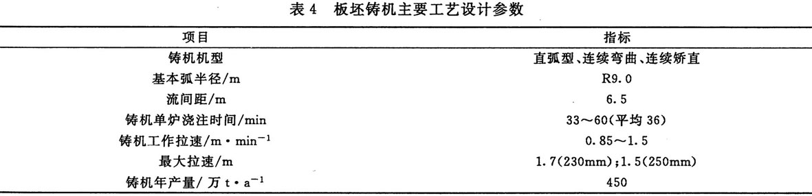 迁钢板坯连铸机采用自动开浇、保护渣自动喂入、中间包液位和结晶器专家系统、动态二冷配水及轻压下、旋转式去毛刺等功能,实现了操作平台无人值守的全自动生产模式。主要工艺设计参数见表4。