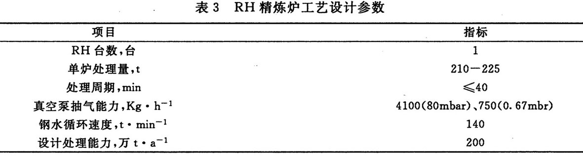 RH真空精炼炉由首钢与德国西马克公司联合设计,外方技术总承包,采用先进的四级蒸汽喷射泵设计,并配有多功能顶枪,主要用于生产超低碳钢和高品质的管线钢,具有脱碳、脱氢、脱氮、脱氧、去除夹杂等冶金功能。强大的真空泵系统和高速的钢水循环速率能够保证钢水在极高的真空度下出色的完成脱碳、脱氢、脱氮等冶金任务,具有合金吸收率高、成分和温度控制稳定、钢水纯净度高等诸多优点。主要工艺设计参数见表3。