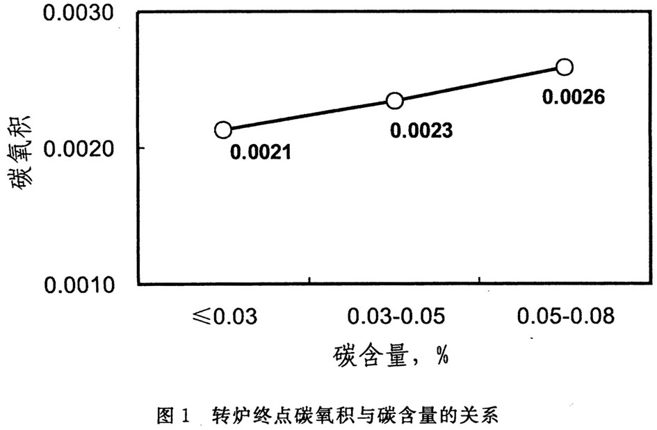 图1是整个炉役期间转炉终点碳氧积随碳含量的变化图。可见,当碳含量≤0.03%时,氧活度平均为887 ppm,碳氧积为0.0021,良好的复吹工艺有效地抑制了钢水的过氧化。