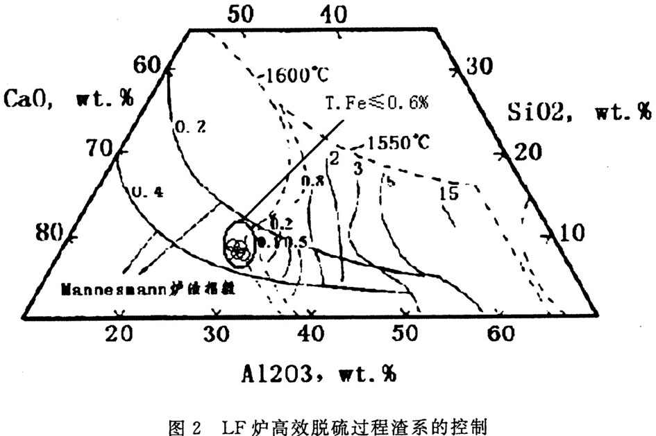 图2为LF炉脱硫渣系控制的实际情况。脱硫的实绩是在30 min以内将平均52 ppm的硫脱至9 ppm。