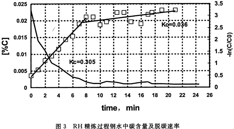 图3为RH高效脱碳过程钢水中碳含量以及脱碳速率的变化。可见,RH真空开始后,钢水中的碳含量也迅速降低,前8 min的平均脱碳速率达到了0.305 min-1,此时钢水中的碳含量降低至12 ppm。