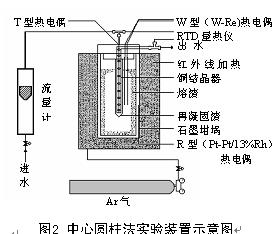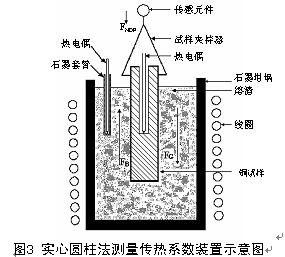 一维稳态同心圆柱法1) A.C. Mikrovas[12]通过圆柱法测定了液渣的传热系数,装置如图3所示,并建立了传热计算的数学模型。将一个圆柱型的铜试样浸入在一个恒温的石墨坩埚中,同时记录圆柱体温度随浸入时间变化的温度曲线,实验在高频感应电炉(45KVA,300V,0~3000HZ)内进行,圆柱体铜试样长120mm,直径12.7mm,每个试样沿对称轴钻一个F3.2mm´70mm的孔,所有试样经过机械抛光以使其接近理想圆柱体。在圆柱体试样的中心插入一支热电偶来测量浸入试样中心的温度。该试样固定在一个微调机构上,浸入深度为100mm。在固定架上安装有一个传感元件来测量试样的重量。通过边界条件得出鲁塞尔准数与有效传热系数的关系: