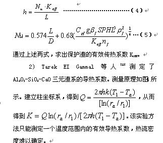 1) P.V. Riboud等[5]通过测定圆柱型渣柱内两点的温度变化来测量熔渣的导温系数。当温度从室温升到渣的熔点温度,记录渣柱内两点的温度,应用热传导的有限差分方程求出导温系数。测试的保护渣导温系数大概为: