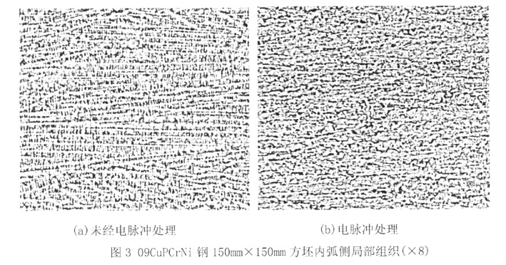 从经过电脉冲处理和未处理的铸坯低倍组织看,经电脉冲处理的铸坯低倍组织明显细化,内部裂
