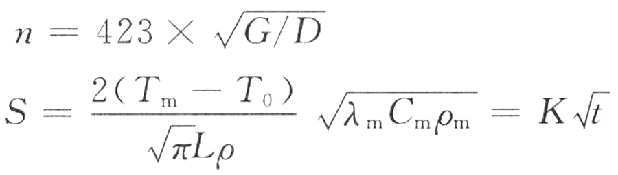 以上式中,n为离心旋转速度,r/min;G为重力倍数,一般取90~120;D为轧辊直径,dm;t为离心旋转时间,s;S为外层高速钢凝固厚度,mm;Tm、T0,分别为离心冷型初始温度和环境温度,℃;L为凝固潜热,J/kg;ρ、ρm分别为高速钢和离心冷型的密度,kg/m3;Cm、λm分别为离心冷型的比热和导热系数;K为比例系数。