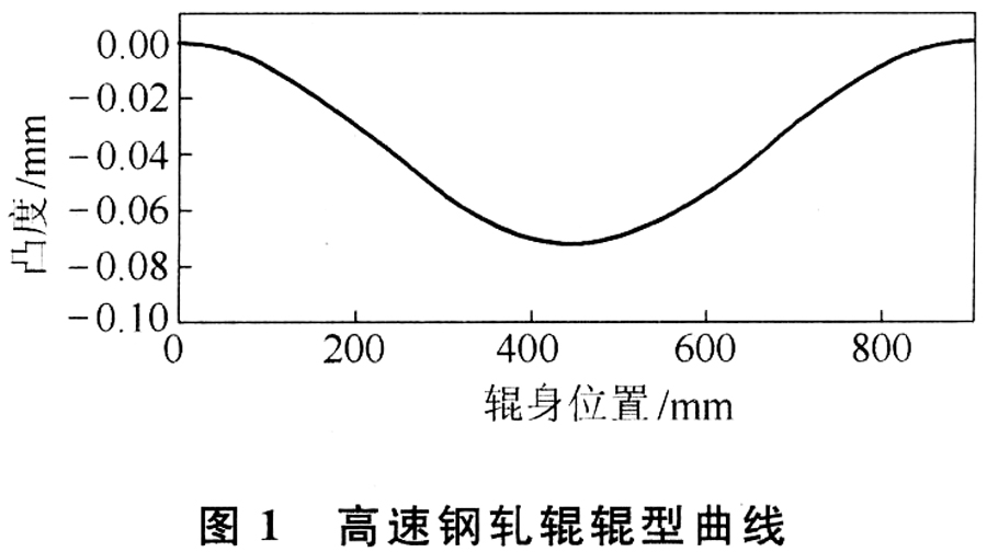 与高铬铸铁相比,高速钢导热系数大,比热小,热膨胀系数较大,且考虑到轧制时轧辊辊身中间温度高于两侧,辊身中间位置膨胀量最大,因此为了便于咬入,并控制板形,设计了负凸度辊型,辊型曲线如图1所示。