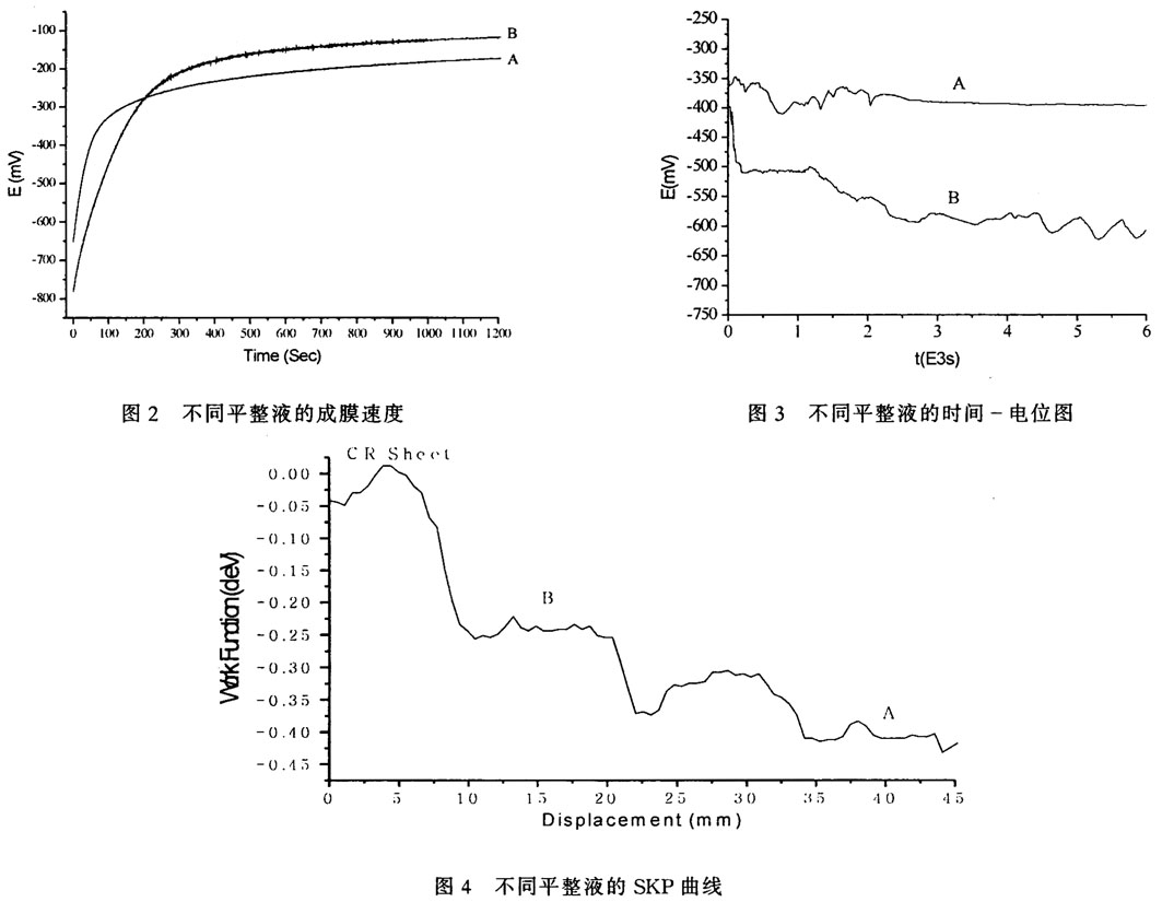由于平整液又是湿平整工艺中使用的重要化学介质,所以其耐蚀性能的好坏以及与后道工序所用化学品的兼容性对冷轧板的耐蚀性能有很大影响。某钢厂有段时间在平整工艺中使用一种无机型商用平整液A,能够很好地抑制平整过程中锈蚀缺陷的产生。在实验室中我们取来平整液A与另一种有机型商用平整液B原液,配制成平整液的最终使用浓度为5%,平整液的配制采用重量百分比,平整液配制时采用的溶济为工业用去离子水,以防水中一些离子对平整液的不良影响。从用恒电位仪测量的冷轧板在两种平整液中的成膜速度曲线(图2)可以看出,平整液A成膜速度曲线的斜率要远大于平整液B,说明冷轧板在平整液A中的成膜速度要高于平整液B,在以经不同平整液处理后试样为研究电极、以蒸馏水为腐蚀介质的电位-时间曲线中也可以看出(图3),平整液A试样较平整液B试样的腐蚀电位正移,说明在纯净的蒸馏水腐蚀环境中,平整液A的耐蚀性优于平整液B,用开尔文探头振动电容法(SKP)测定的经不同平整液处理后的冷轧板的功函数曲线中(图4),平整液A的功函数相对值明显小于平整液B,也进一步证实了这一点。