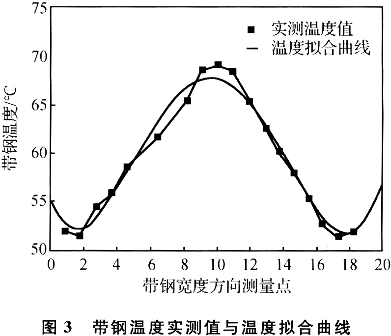 使用红外测温仪实测出末机架出口带钢各部位温度后,通过曲线拟合可以确定其温度分布函数,如图3所示。经过数学处理后的温差分布函数为: