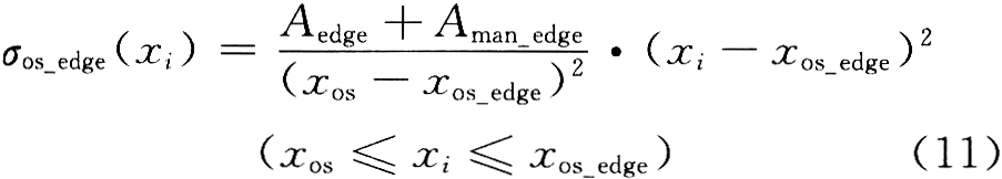 式中:Aedge妇为边部减薄补偿系数,根据生产中出现的带钢边部减薄情况确定,由过程计算机计算得到,发送给板形计算机;Aman_edge为边部减薄系数的手动调节量,这是为了应对生产中边部减薄不断产生变化而设定的,由斜坡函数生成,并经过限幅处理;xos_edge为从操作侧第一个有效测量点起,最后一个带有边部减薄补偿的测量点坐标,它们都是整数。