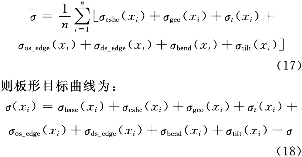 式中:J为评价函数;”为板宽方向特征点数;gi为板宽方向上各特征点的权重因子,代表调节机构对板宽方向各个特征点处的板形影响程度,边部特征点的权重因子要比中部区域大;σʹi为第i个特征点处板形实测值,同板形目标曲线一样,经过由板宽方向的测量段到特征点的处理;m为板形调节机构数目,△uj为第歹个板形调节机构的调节量,Eff,ij为第j个板形调节机构对第i个测量段的板形调节功效系数。