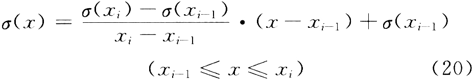 得到数轴X2上的特征点在数轴X1上对应的坐标x后,首先确定该坐标在数轴X1上的2个边界点xi-1和xi,再利用这2个边界点处的目标张应力插值计算坐标x处的目标张应力,计算方法如下: