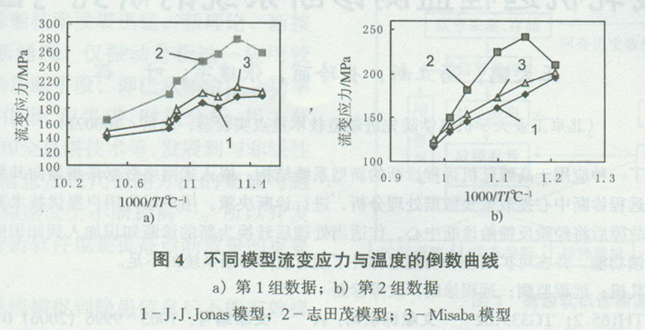 分别采用第1组、第2组数据,对流变应力的模型作了比较,如图4所示。在相同的变形条件下,Misaka模型和J.J.Jonas&Hodgson模型的结果比较接近,而志田茂模型的结果相差较大。因为缺少工业现场的数据作比较,对模型的适用性尚不能确定。