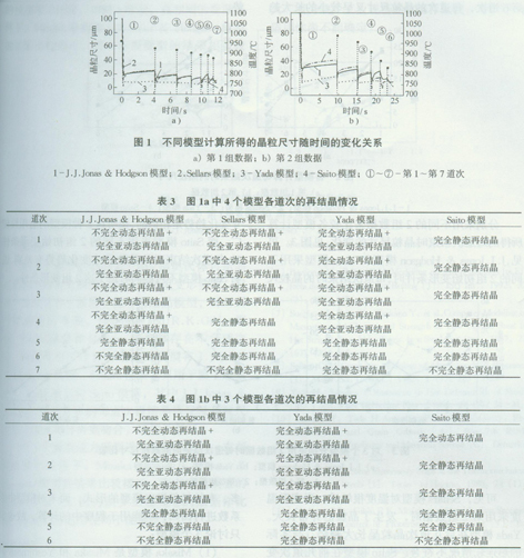 上述计算结果显示,当采用完全相同的初始条件时,不同的模型各道次的再结晶情况各不相同。比较表3、表4,除了Saito模型,其他模型在前几道次都发生动态再结晶及之后的亚动态再结晶,而由动态再结晶发生的2个条件可知,当变形量大于动态再结晶发生的临界变形量,并且温度补偿变形速率因子Z小于临界值Zc时会发生动态再结晶。所采用的变形参数的前几道次具有较大的变形量,同时具有较高的变形温度和较低的变形速率,因此较易发生动态再结晶。相对于静态再结晶来说,亚动态再结晶的速度要快得多,而前几道次的道次间隔时间较长,因此亚动态再结晶可以完全发生,这与所得的结果吻合。而后几道次会发生静态再结晶,J.J.Jonas&Hodgson模型后2道次都发生不完全静态再结晶,晶粒细化较明显;Sellars模型和Saito模型的最后一道次发生不完全静态再结晶,可能是很短的停留时间(第1组数据为0.4s;第2组数据为1.6s)使得静态再结晶不能发生完全;Yada模型的后几道次都发生完全静态再结晶。