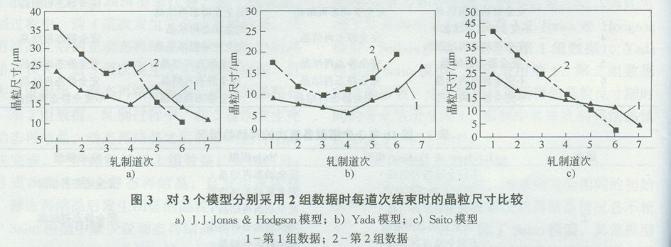 分别采用不同的2组数据来比较各模型计算 所得的每道次结束时晶粒尺寸的变化,见图3。可 见J.J.Jonas&Hodgson模型和Yada模型采用不同的2组初始变形条件时,每道次结束时的晶粒尺寸变化趋势是相似的,说明这2种模型的适用性较广。而Saito模型采用不同的2组初始变形条件时,每道次结束时的晶粒尺寸变化趋势有差别,说明Saito模型不可能同时适于这2组变形条件。