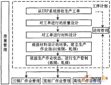 系统从ERP系统接收生产计划一工单,工单可以是经ERP组合后的销售订单及预测计划;也可以是1∶1的直接销售订单。接收的工单以三级质量标准为依据,进行质量设计,通过质量设计,可将工单的需求转化为具体对各工序及管理岗位的要求,包括成分、材质、交付条件、生产工序关键控制参数、取样等。质量设计的结果将随其后的作业指示下发到流程线上的所有相关工序和岗位,指导和控制生产过程,以达到提高产品质量和提高产品命中率、合格率的要求。只有成功通过质量设计的工单才能在MES内成为可执行的对象。质量设计后的工单,将进行材料设计,材料设计的结果是将产品工单转化为坯料需求,最终形成炉次需求、浇次需求。经过材料设计,完成产品需求到流程上各工序需求(如:转炉、连铸、轧制、分断)的转化。材料设计的结果经生产管理人员确认后,作为具体化的生产任务下发给炼钢厂和轧钢厂生产管制人员;生产管制人员通过对现场生产状况及生产任务的综合考虑,将生产任务转化为可执行的炼钢、轧钢作业指示下发给各生产岗位和工序,同时通过对指示在各工序上完成状态的实时、准确的监控,以及对全厂整体状况的实时监控,针对生产中出现的异常情况可及时进行调整,保证生产连续、高效、可控。生产管制中心下达的指示进入作业管理系统,作业管理系统将指示分发到作业线上所有的相关工序、岗位;各工序通过与二级控制系统的直接集成完成生产状况及生产实绩的收集,监视及保证物流进程,在生产发生异常时及时向生产管制中心反馈信息;同时作业管理系统还要完成生产设备的集中统一管理,如炼钢厂的钢包、中间罐,轧钢厂的循环品。