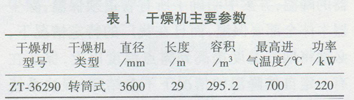 精矿干燥采用的主要设备是zT一36290转筒干燥机,其作用是将含有11%以上水分的精矿粉进行干燥,使其含湿量降为5%左右,干燥精矿粉量为30 t/h。干燥原理是对流传热干燥,这也是目前在工业上应用最普遍的一种干燥方式。它所采用的介质是来自干燥机前端的沸腾炉所产生的热废气,沸腾炉内加人燃料煤,并用增压风机鼓入助燃空气,经过充分燃烧后在炉膛内产生700℃~800℃的热废气。在除尘风机形成的负压作用下,高温气体流经转筒式干燥机与湿精矿粉充分接触换热,高温气流将热能传到物料(精矿粉)表面,再由表面传至物料(精矿粉)内部,使水分从物料内部以液态或气态扩散透过物料表面,然后,水汽通过物料表面的气膜而扩散至热气体中。干燥机主要参数列于表1。