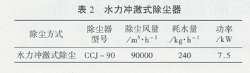 原有除尘系统是用水力除尘,选用的是冲激式除尘器(见表2),除尘器风量为90 000 m3/h,用水量240 kg/h,含水汽含尘烟气经过水力冲激式除尘器后净化外排。该除尘设