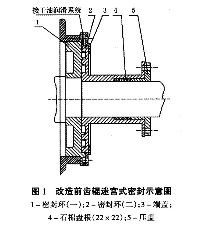 齿辊与炉体密封原设计为迷宫式密封,密封距离短。其径向密封由密封环(一)、密封环(二)及润滑装置组成;轴向密封采用22×