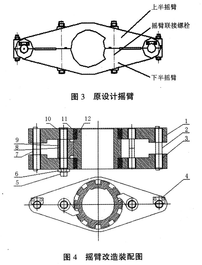 齿辊传动方式采用棘轮棘爪结构,通过改造齿辊摇臂,利用连杆摆动棘爪棘轮,实现了摇臂由57摆动到步进式360°转动。这样,一方面使齿辊的运转同步,摆幅一致,避免了下料不均匀;另一方面这种传动方式也能有效地解决齿辊上下表面受热不均匀的问题,防止齿辊下挠变形而影响密封;再则这种传动方式保证了齿辊的均匀润滑。改造前后摇臂示意图见图3、图4。