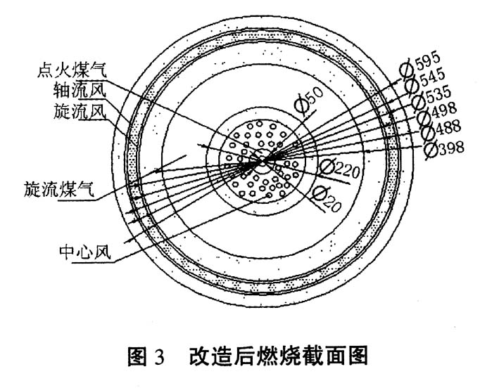 其次,是提高各气流通道表面的加工精度,最大限度地减小气流通过的阻力。对各通道的同轴度也提出了严格要求,保证气流喷出后具有良好的方向性。并对旋流煤气和空气出口导向叶片角度进行了适当调整,保证内层气流合理旋转,从而保证了空、煤气混合效率。为了进一步确保轴流风有良好的方向性,还在燃烧器出口处外侧加设了拢焰罩,强化对轴流风的方向控制