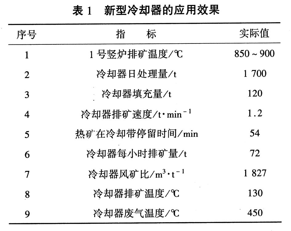 2)该冷却器在济钢1号竖炉上应用,一次性试车成功。近半年多的实践表明,设备运转正常,各项指标完全达到设计要求。