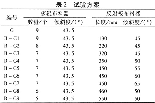 具体试验方案见表2。试验时固定圆辊给料机的转速30 r/min,多辊布料器的倾斜角度固定为43.5°,辊的转速固定为34.88 r/min,试验变量包括多辊布料器辊数、反射板倾斜角度和反射板长度。