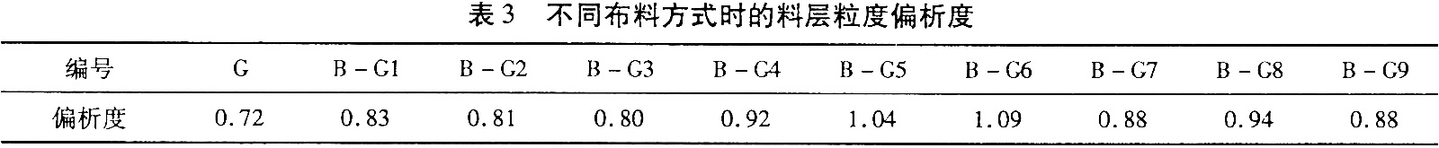 由表2可见,序号G表示多辊布料器(9辊)的布料试验;序号B—G表示板—辊联合布料器的布料试验,其中序号B—G1~B—G3,为固定反射板倾斜度45°,B—G4、B—G8和B—G9为固定反射板倾斜度为50°、改变辊的数量和反射板的长度的布料试验;B—G4~B—G7为辊的数量不变(7辊)的情况下,改变反射板的角度和长度的布料试验。