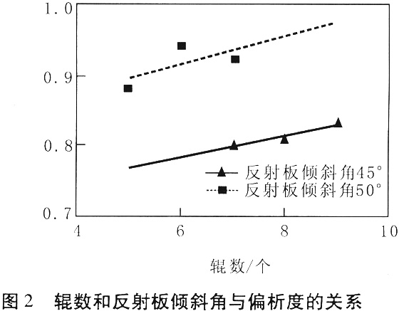 由图2可见,反射板倾斜角由45°提高到50°,偏析度明显提高,辊数增加,偏析度增加。