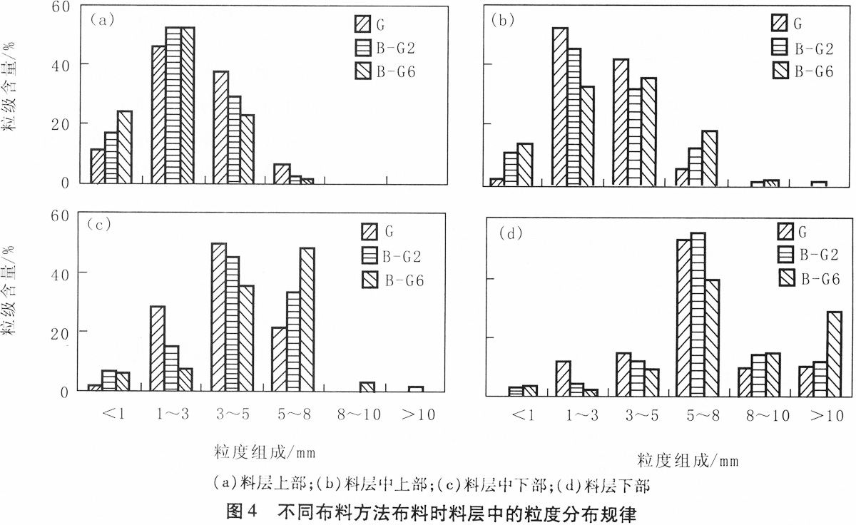 (4)在料层下部混合料粒度范围主要为5~8 mm粒级,布料方式从多辊(G)改变为板|—辊联合(B—G),尤其是增加反射板倾斜度(由B—G2改为B—G6),8~10 mm和>10 mm粒级增加,5~8 mm和3~5 mm粒级降低。