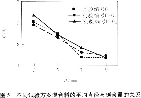 料层中混合料的平均直径与其中碳含量的关系见图5。