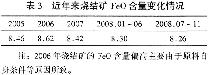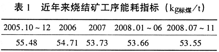 烧结工序能耗是指生产一吨烧结矿生产和生活(指场内)所有的全部煤、焦炭、煤气、汽油及水、电、蒸汽、压缩空气、氧气等折合标准煤。主要包括生产用的固体燃耗、煤气燃耗、电耗、水、蒸汽、压缩空气等消耗。其中,固体燃料消耗约占75%,电耗15%,煤气消耗约占6%。莱芜钢铁股份有限公司烧结厂新二区(简称莱钢烧结厂新二区)265 m2烧结机于2005年10月建成投产以来,不断优化烧结生产工艺,采取多项技术措施,使烧结工序能耗逐年降低(见表1),取得了较好的效果。