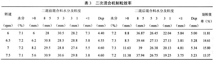 从表3和图4可见,在二混后的混合料Dcp(mm)看,混合机转速7rpm比6rpm大0.06mm,比7.5rpm大0.11mm,从制粒效率看,混合机转速7rpm比6rpm高7.77%,比7.5rpm高2.03%。混合机转速从6~7rpm时,混合机转速提高制粒效率提高,转速为7.5rpm时制粒效率反而降低。这表明应该兼顾混合机弗劳德准数与混合机填充率。当混合机转速为。7rpm时,填充率偏低,但混合机转速较快(5~7rpm)、混合料能被带到一定高度,运动方式以“滚动”状态为主,滚动距离较长——制粒时间较长。有利于提高混合机的制粒效率。