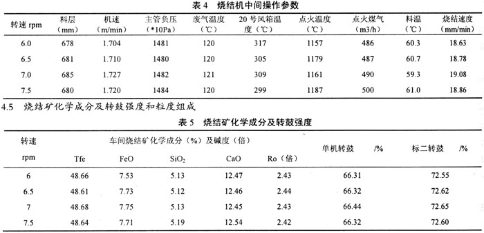 从表4可见,随着混合机转速提高,垂直烧结速度增加(机速加快、料层增厚),但超过7.5rpm时垂直烧结速度降低。而且,在主管负压、废气温度、20号风箱温度、料温基本相当的情况下,当混合机转速为7.0rpm时料层最厚,比转速为6.0rpm厚。7mm。
