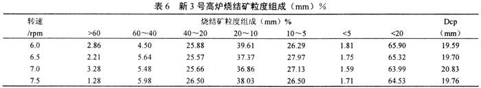 (5)新料42~45kg/m,6号烧结机二次混合机转速为7rpm时综合指标最好。
